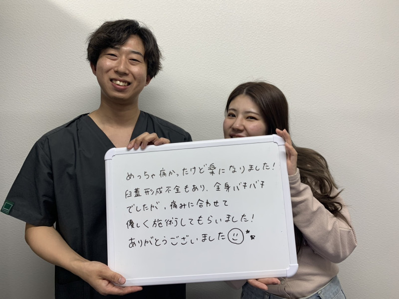 「めっちゃ痛かったけど楽になりました!全身バキバキでしたが、痛みに合わせて優しく施術してもらえて良かったです!」
